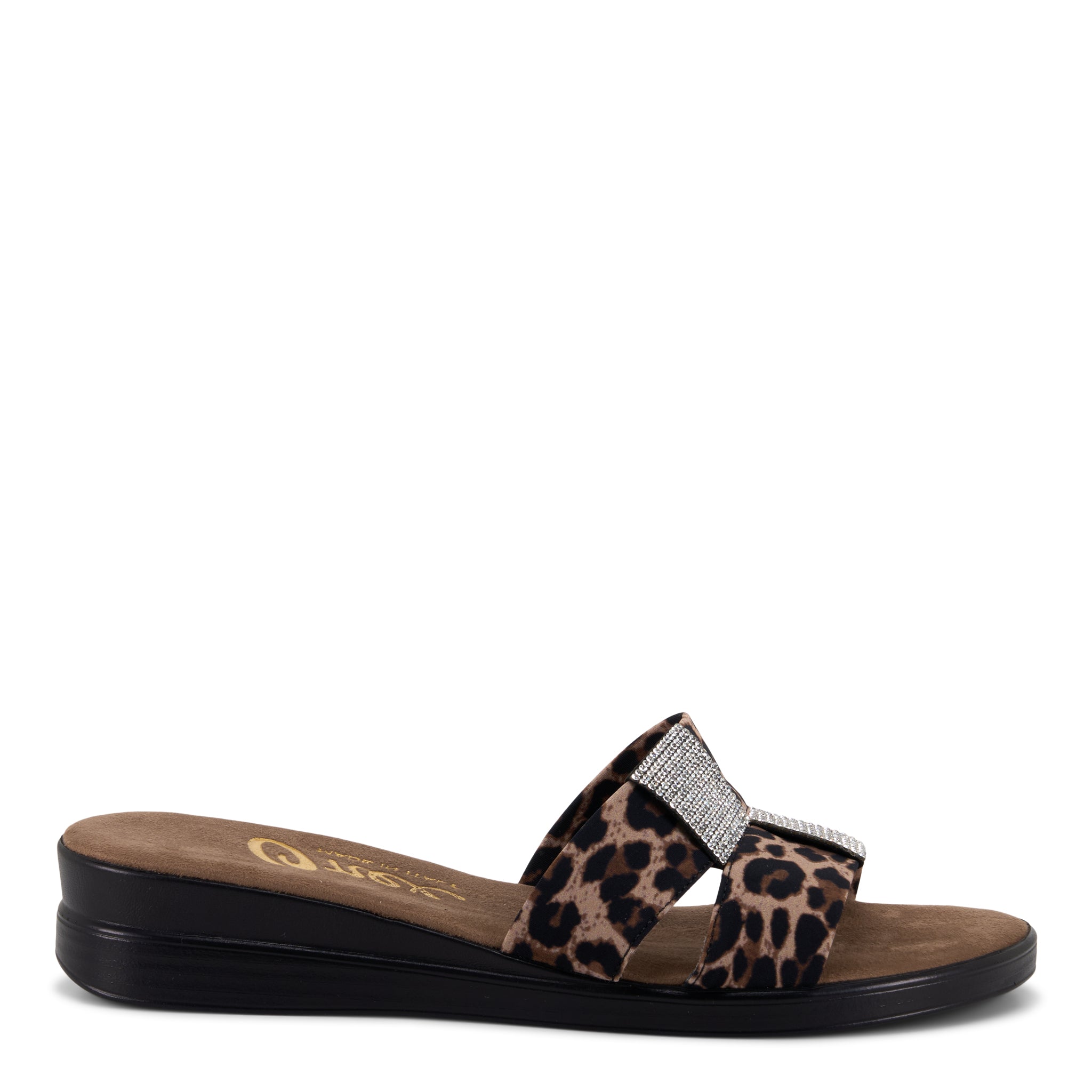 Sparkle with every step in the Lino. This elegant slide features a soft, dual-strap upper adorned with a brilliant rhinestone-encrusted center ornament. Built on a lightweight, cushioned low wedge, it offers the perfect balance of glamour and all-day comfort.
