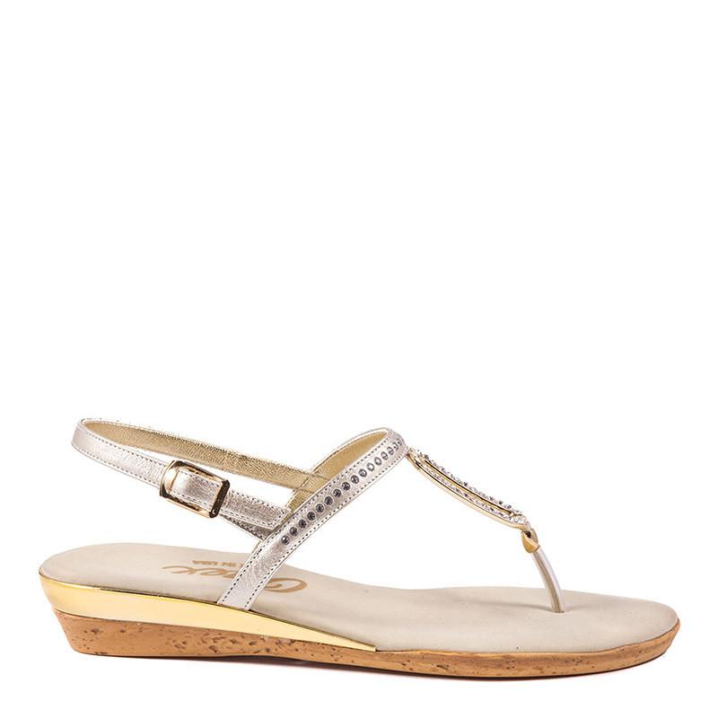 The Cabo thong sandal is a fun addition to your summer collection. The soft leather and Swarovski crystals adds style to any outfit. Matching metallic ornament and heel cover add a hint of glamour. The adjustable slide back strap allows for a better fit. Cushioned insole for added comfort.