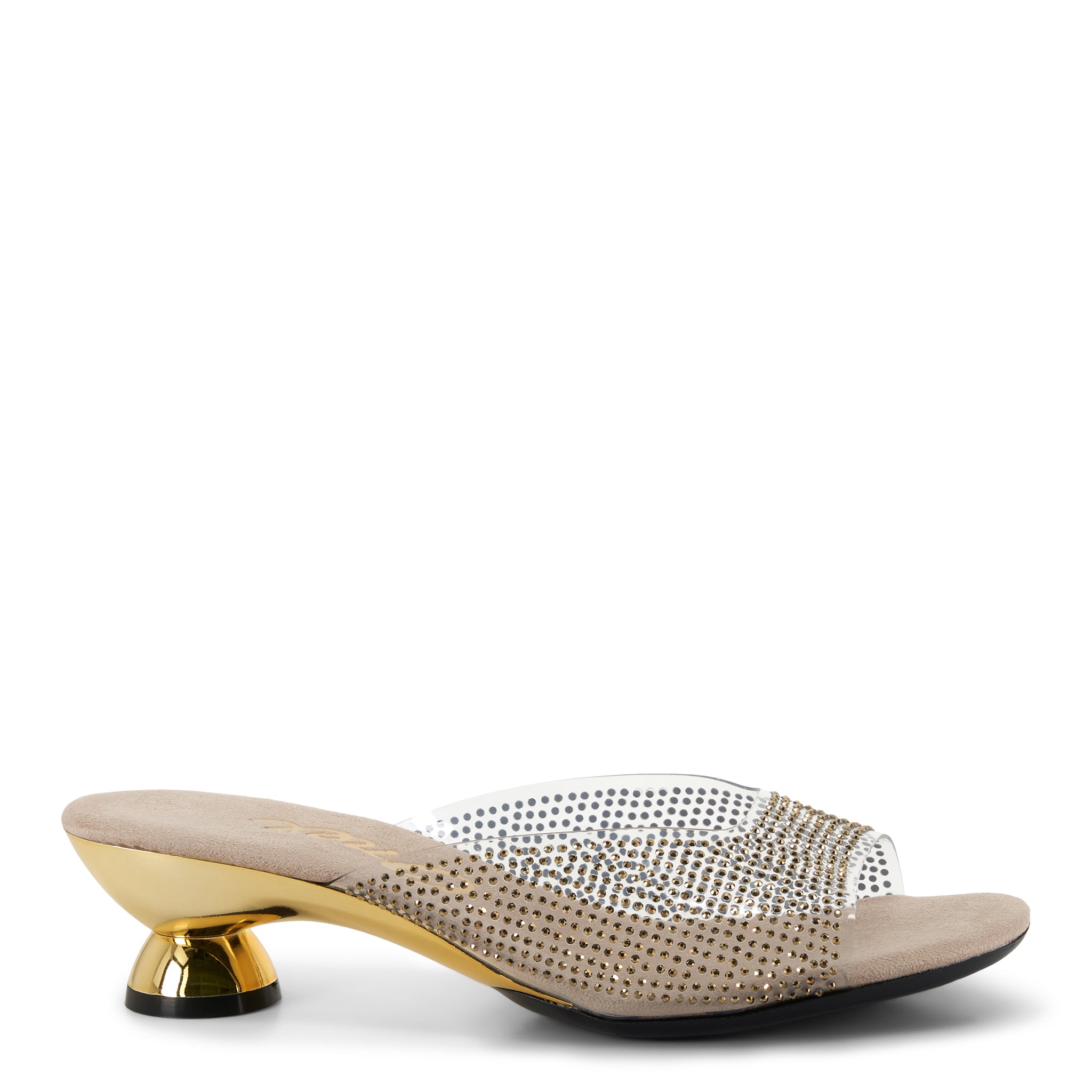 Step into a sparkly evening look with Dani ! These sleek shoes boast a clear upper that conforms to your foot, covered with the perfect amount of rhinestones to turn heads. Plus, you'll love the unique heel with its metallic accents—adding a touch of glam no matter the occasion! Comfort comes standard, thanks to a cushioned footbed, so you can wear Dani all night long. Sparkle your way through the night!