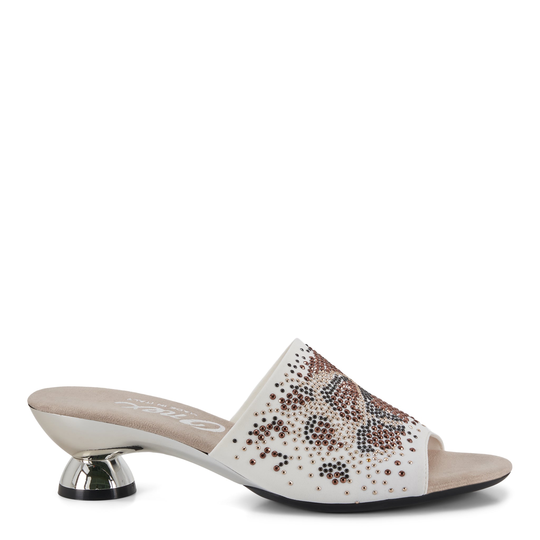Simple, elegant and classic slip on-off silhouette with beautiful rhinestone and metallic stud details to complement any look. Soft elastic upper with matching metallic stripes and heel. Cushioned footbed.