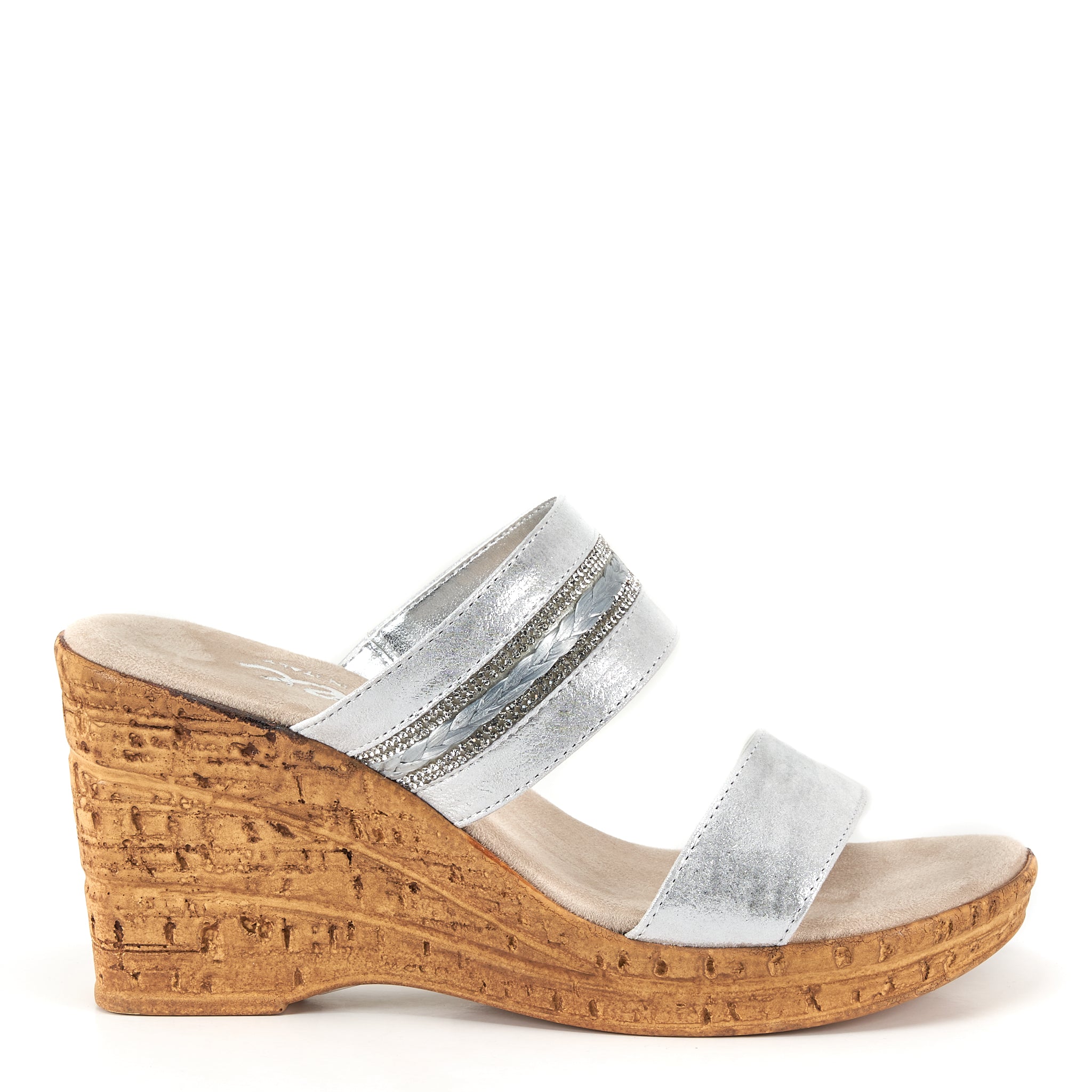 A simple yet elegant two band upper featuring gorgeous metallic accented Italian fine suede material as well as rows of crystals and matching weave accent to compliment the look. Hidden elastic goring for comfort and flexible fit. Signature Onex cushioned footbed.