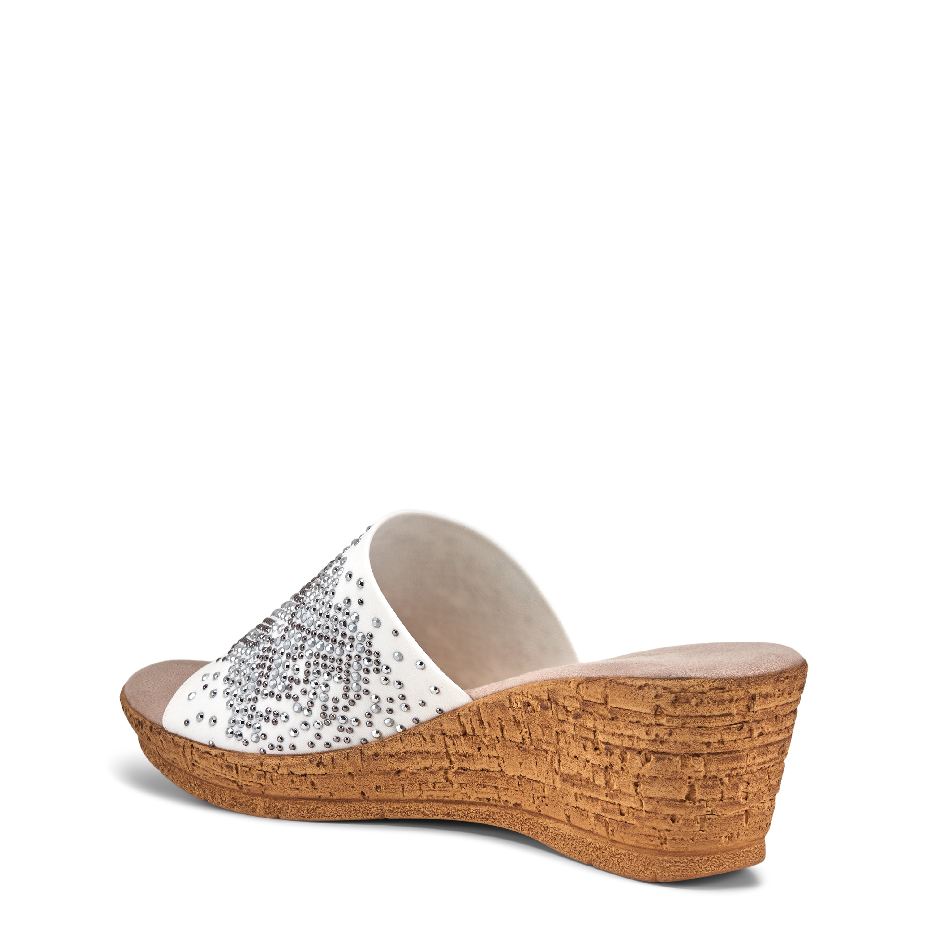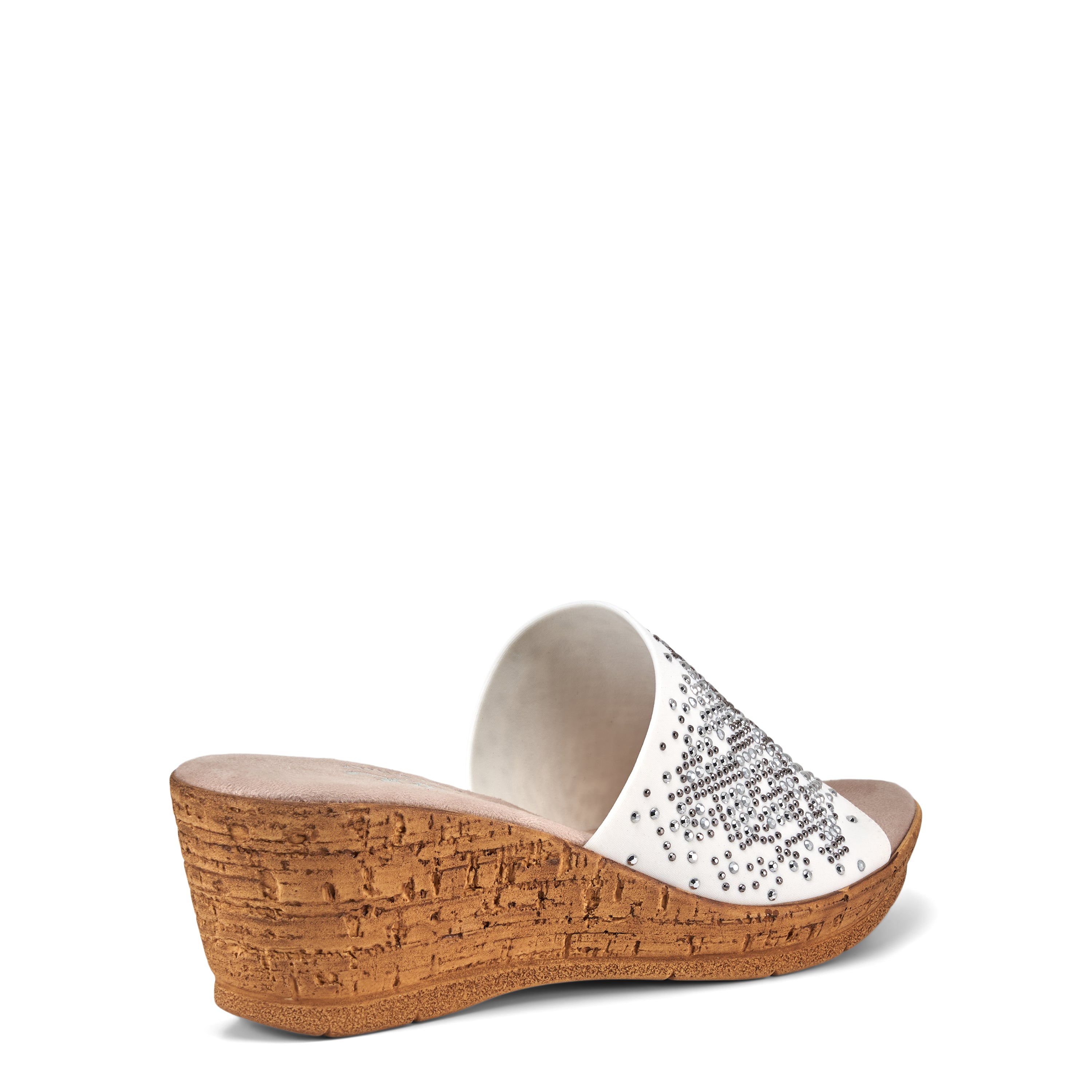 Joline is a comfortable low wedge which easily coordinates with any outfit. The metallic stud accents enhance the look making it versatile from day into night. Elastic Upper, self-lined. Fully cushioned insole for added comfort all day or night.