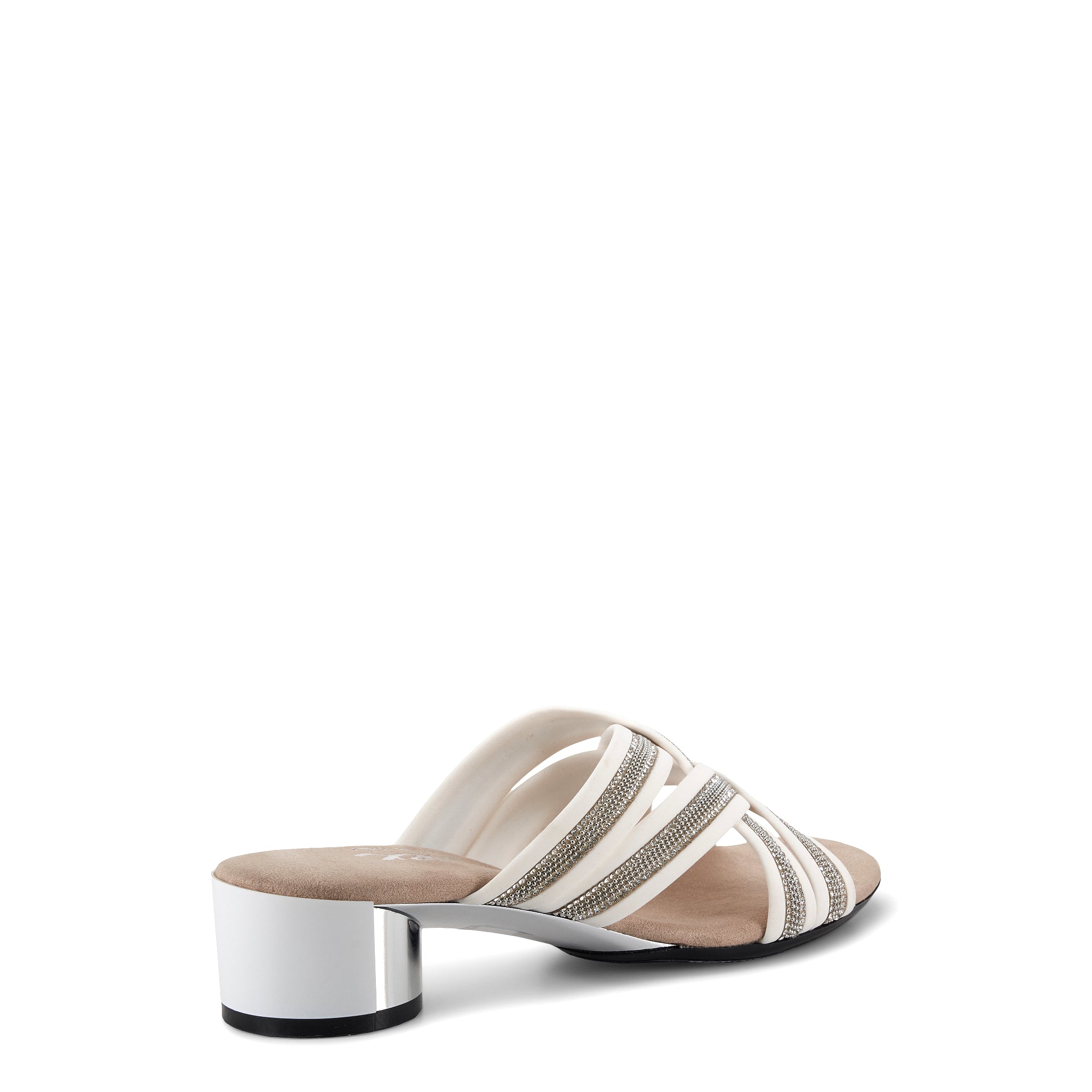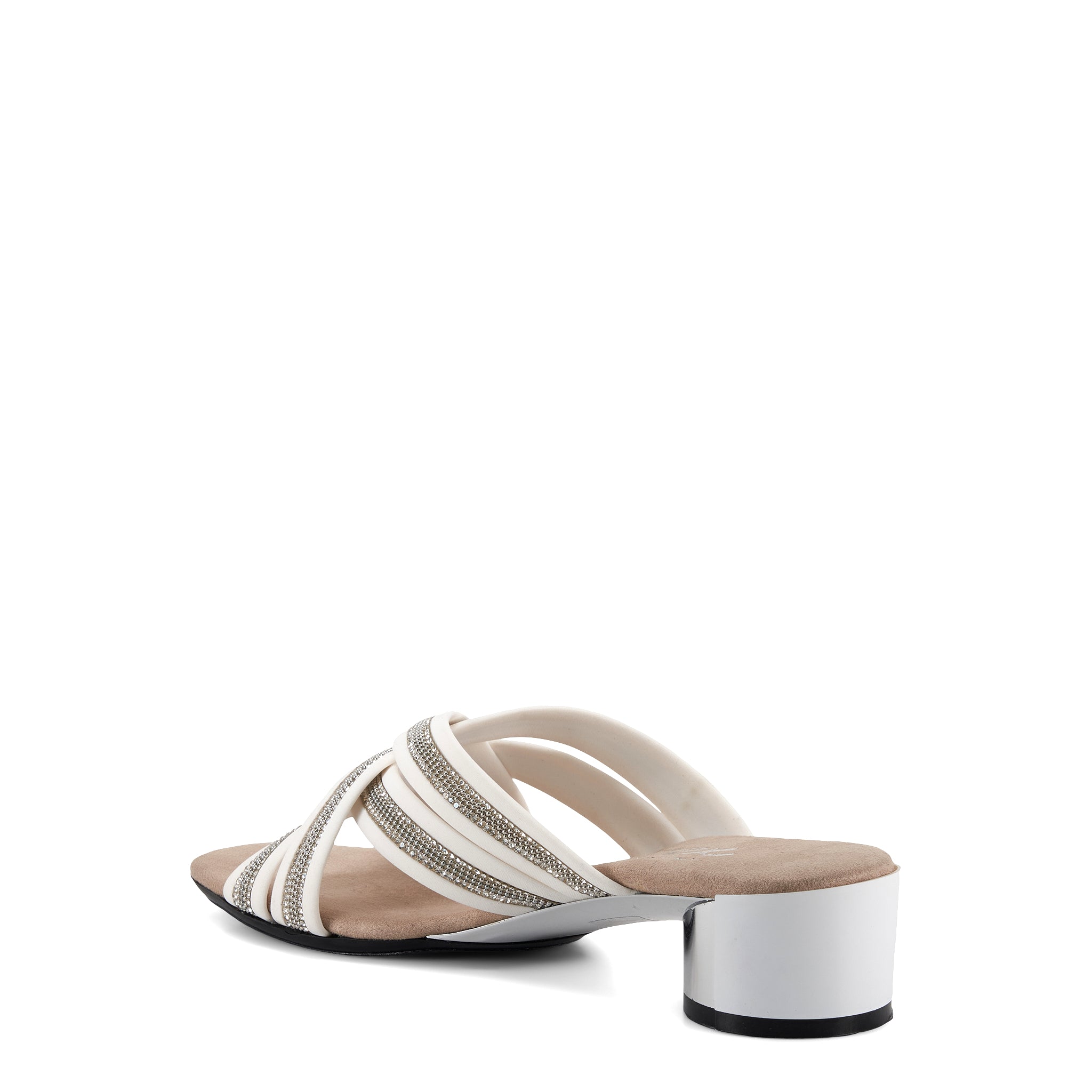 Misha an elegant, comfortable, yet distinguished style for your next night out! Features criss cross soft elastic straps decolorated with crystals. Slip-on-off silhouette with soft self-lined elastic. Matching color heel with metallic accent. Fully cushioned footbed