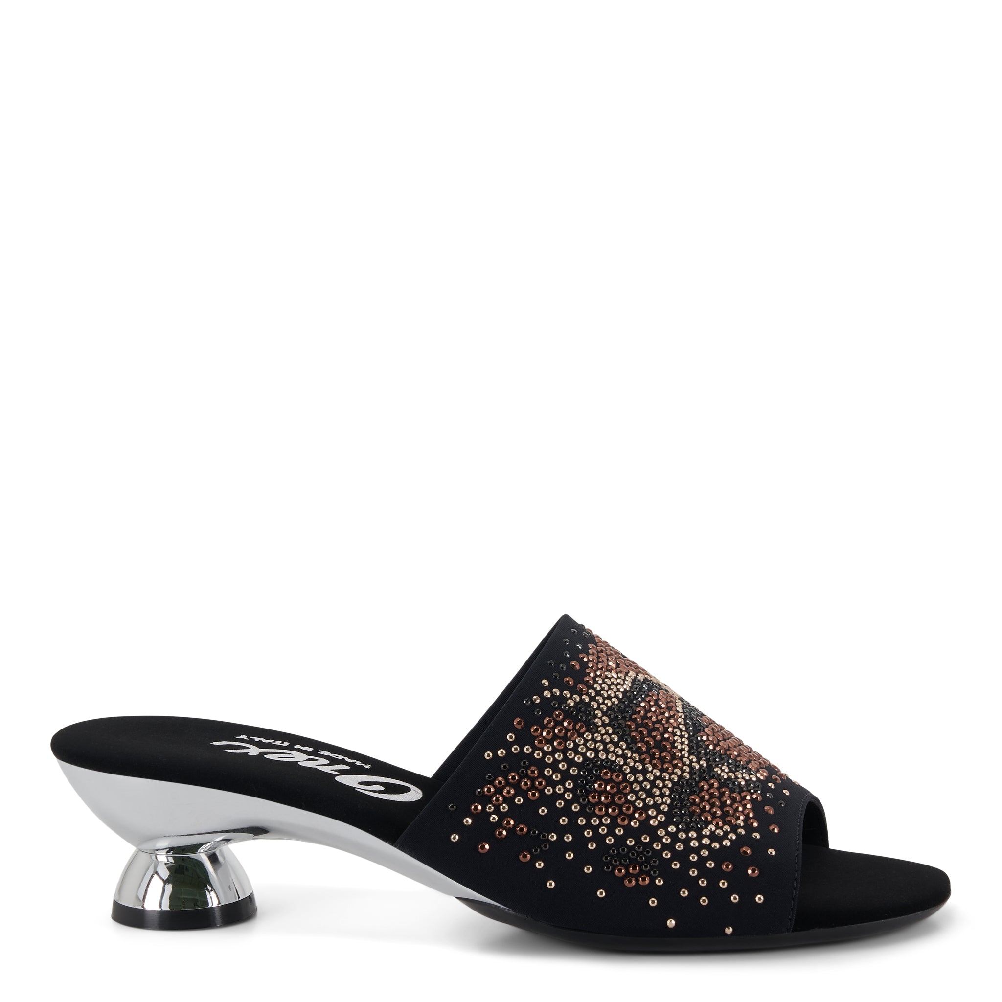 Simple, elegant and classic slip on-off silhouette with beautiful rhinestone and metallic stud details to complement any look. Soft elastic upper with matching metallic stripes and heel. Cushioned footbed.