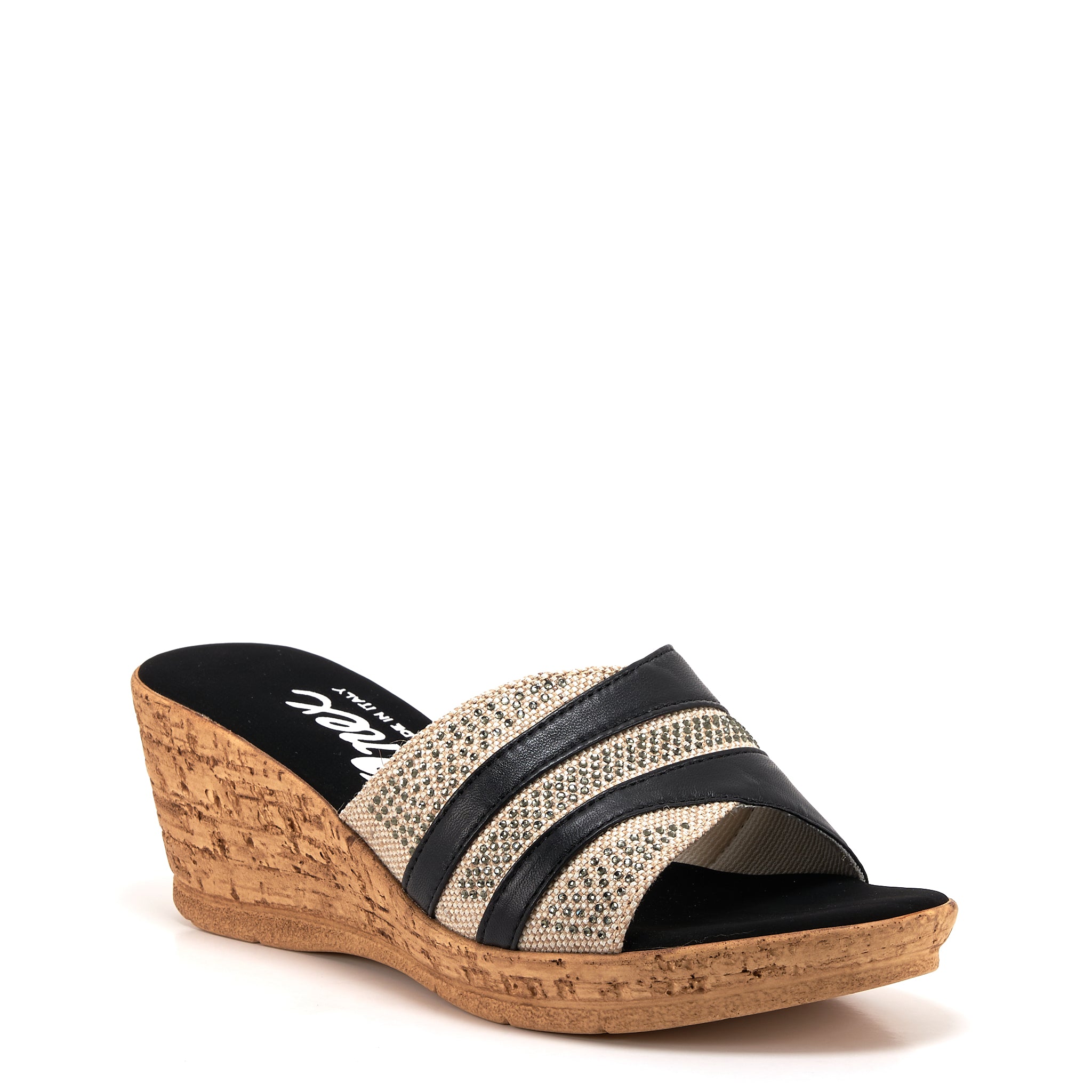 Perfect step-in wedge with a sophisticated, chic upper. Add dazzling touches to your look with the luxurious Blanche. Leather and textile upper with decorative rhinestone and ornament accents. Easy slip-on style. Soft Foam Lining. Cushioned footbed.