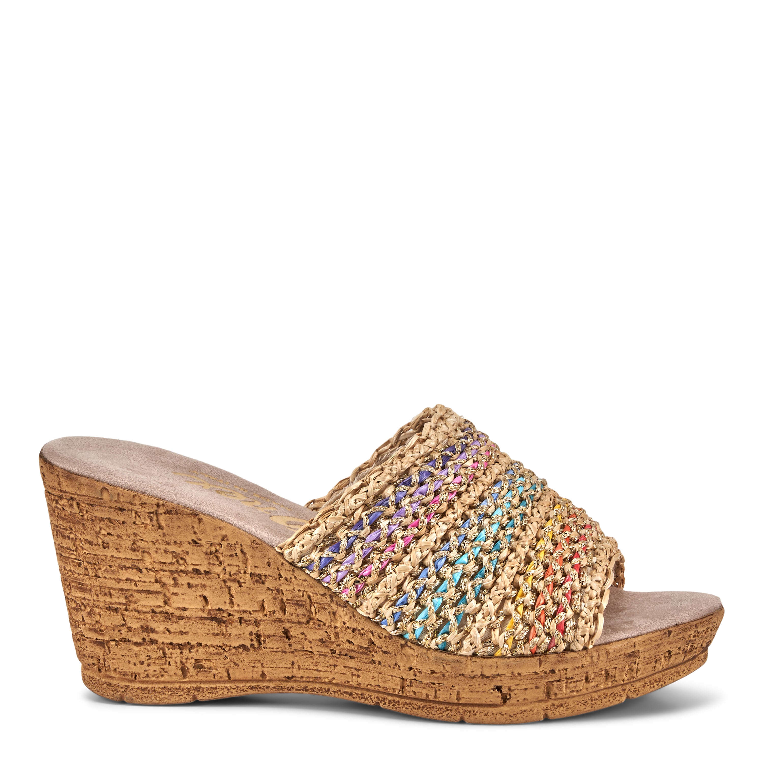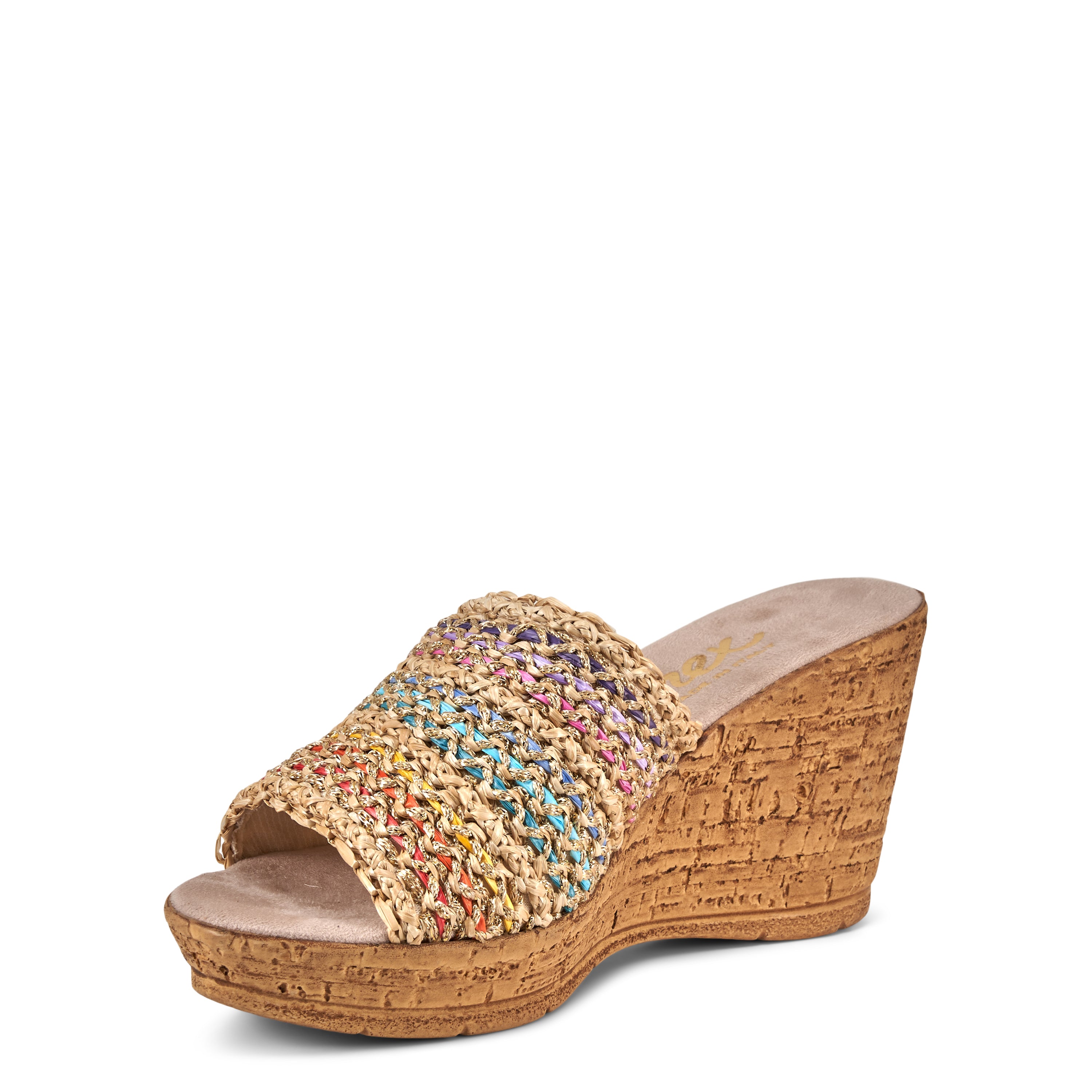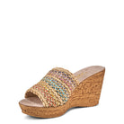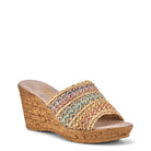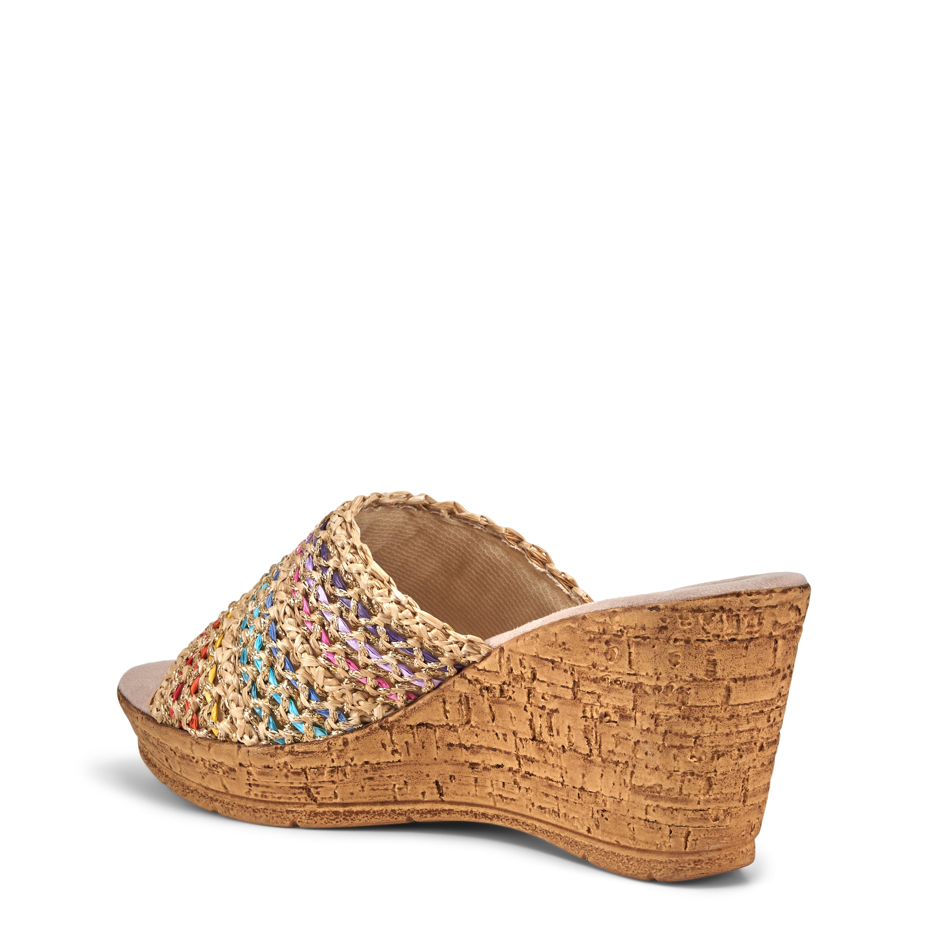 Whether you are staying in town or traveling the world, Claire is a must have slip-on-off sandal that goes with everything! The beautiful weave and detailed color combinations compliments any outfit, and the soft foam lining and lightweight cork wedge provides all day comfort. Cushioned insole for added comfort.