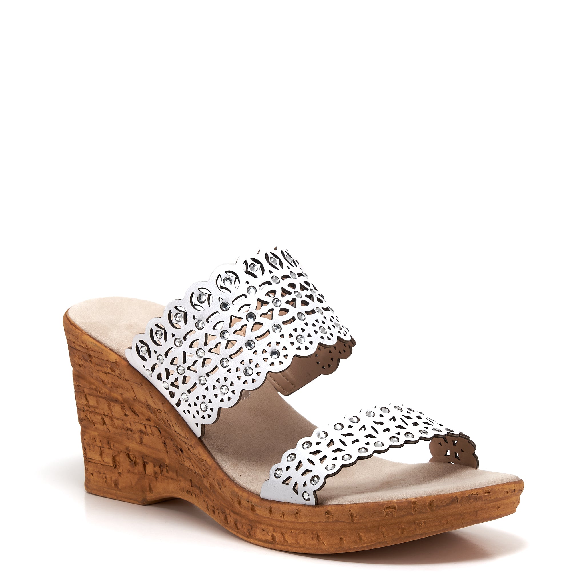 Your feet will be saying "thank you" with the Monette, your go to high wedge sandal to dress up any day outfit! Look fashionable and be comfortable with this nubuck leather sandal with beautiful cutout accents lightly decorated with rhinestones. Cushioned insole for added comfort.