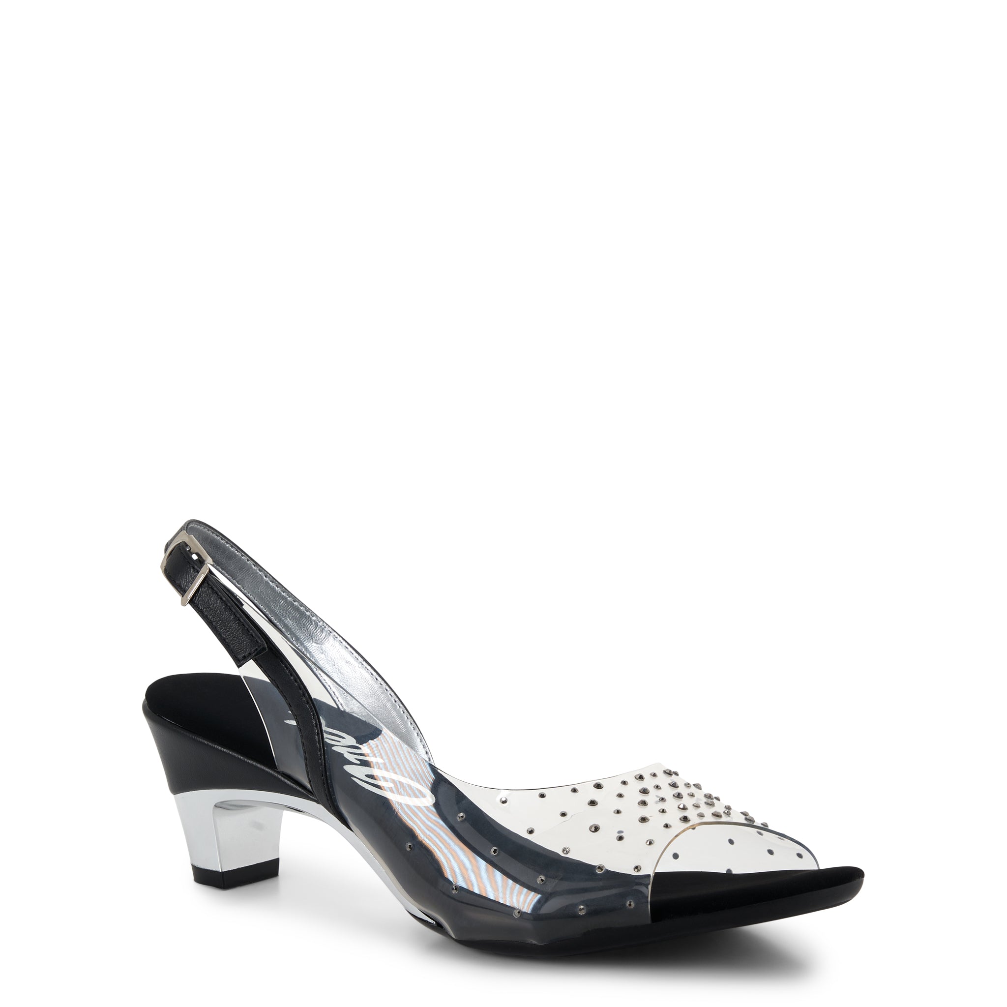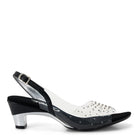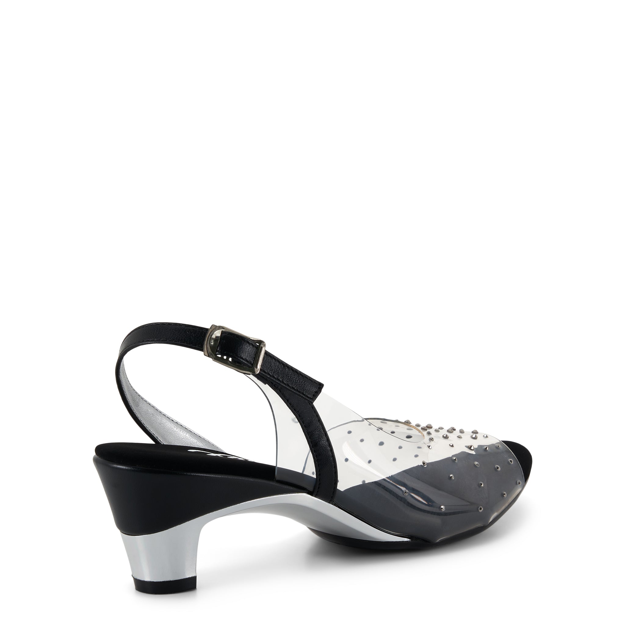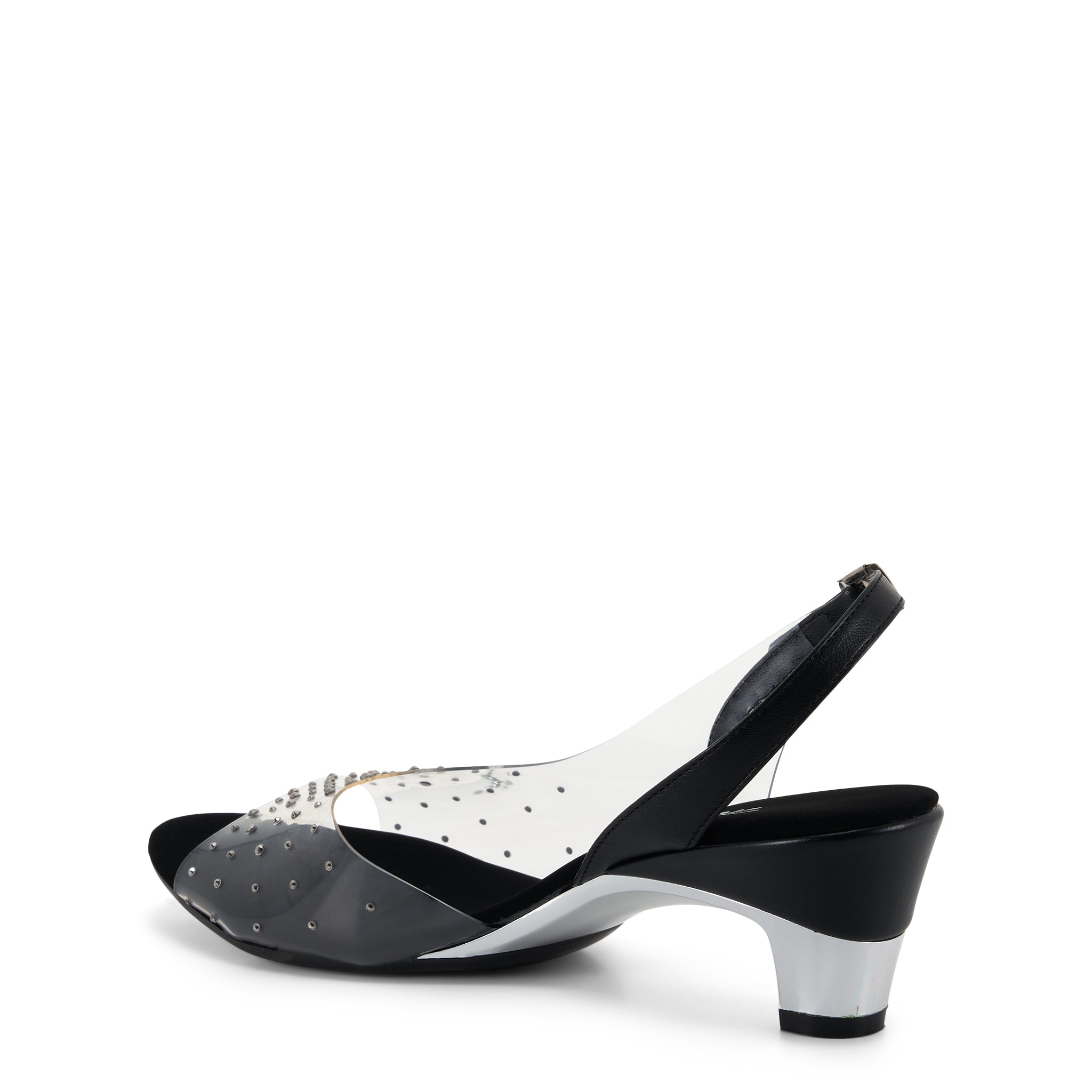 Be glamorous and stylish in the Suzanne / Black slingback. Crafted with an adjustable slide strap for a secure fit, it features a clear front piece exquisitely adorned with delicate rhinestone accents. An elegant metallic heel with a color matching leather accent provides the perfect finishing touch.