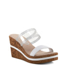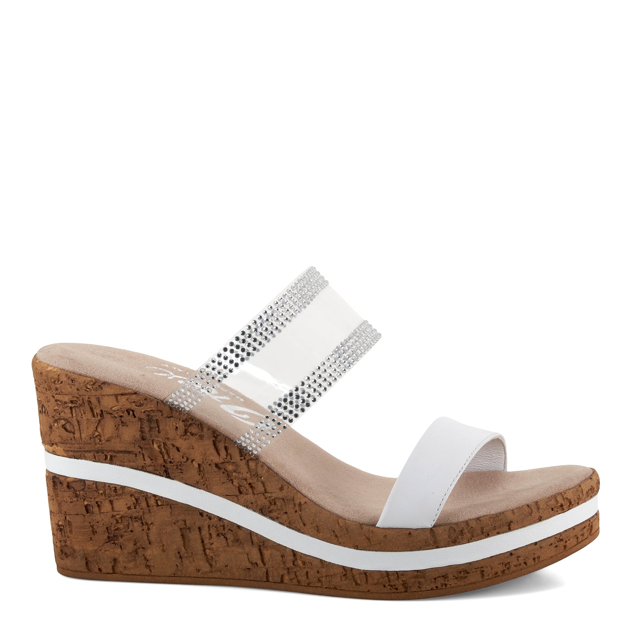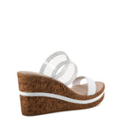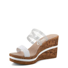 Introducing Vanish, a clear statement piece that will make you shine. This shoe features a clear vinyl upper band adorned with sparkling rhinestones, paired with a leather toe band, all sitting on a faux cork wedge, with matching leather accent. Make a lasting impression with this unique and fashionable design. The "Vanish" is perfect to step out in style whether you're dressing up or keeping it casual.